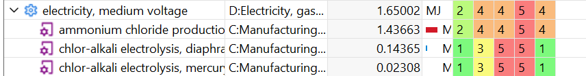 When the calculations are done, the results window will open in the Editor. You will notice that the data quality of the inventory analysis is now shown in the inventory analysis tab with color-coded numbers.