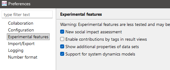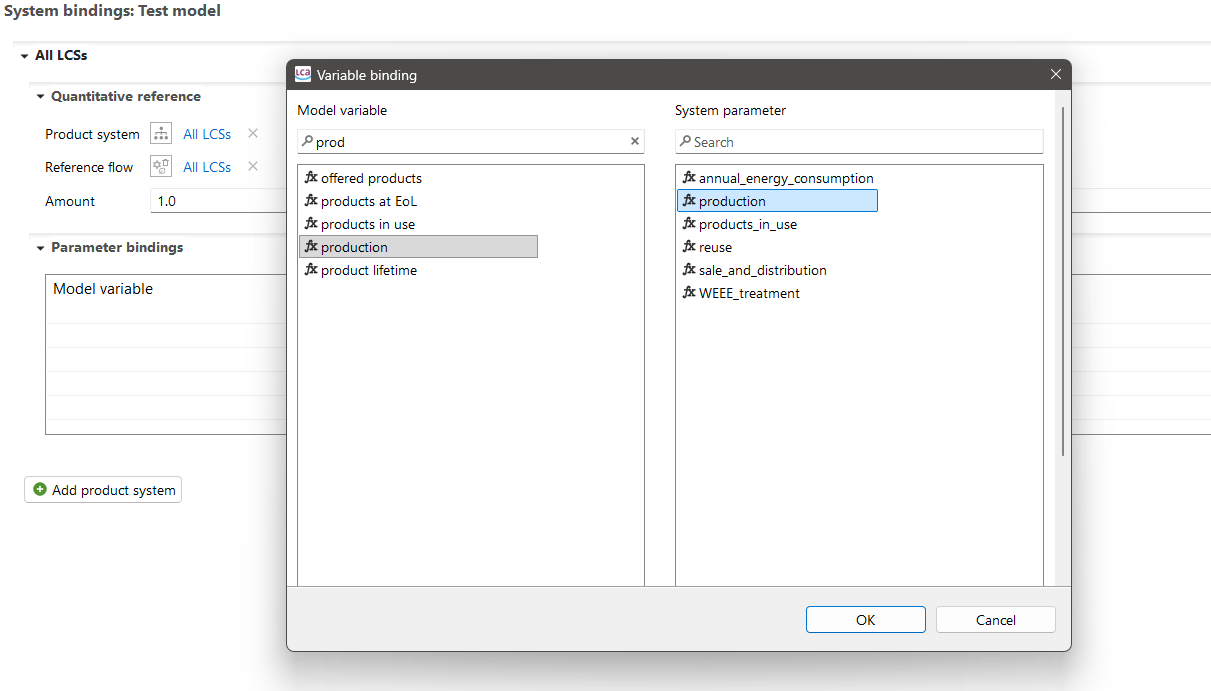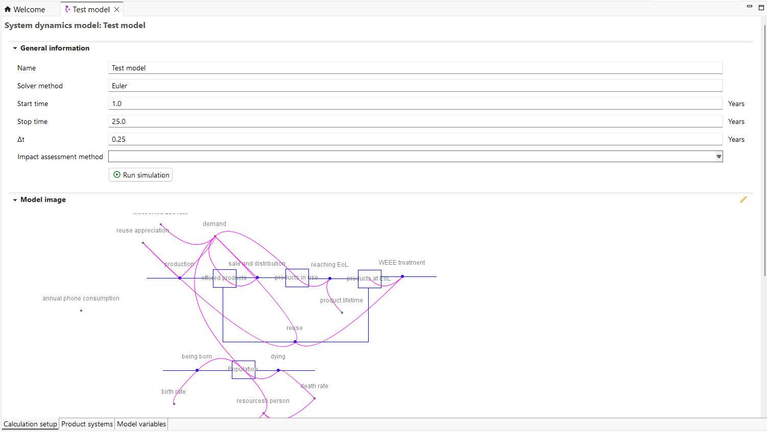 When your model works, you can link its model variables to parameters of product systems. In the "Product systems" tab, you can bind a model variable (stock, rate, auxiliary) to parameters of selected product systems. Note that you can only bind variables that evaluate to plain numbers to parameters as openLCA does not support other data types other than numbers for parameters. However, the SD simulation engine of openLCA has support for arrays that can be used in model variables.