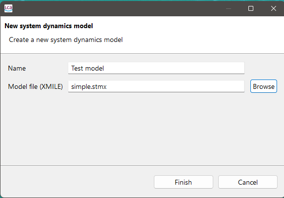 The pop-up window allows you to give your systems dynamics model a name and select the XMILE file of your model.