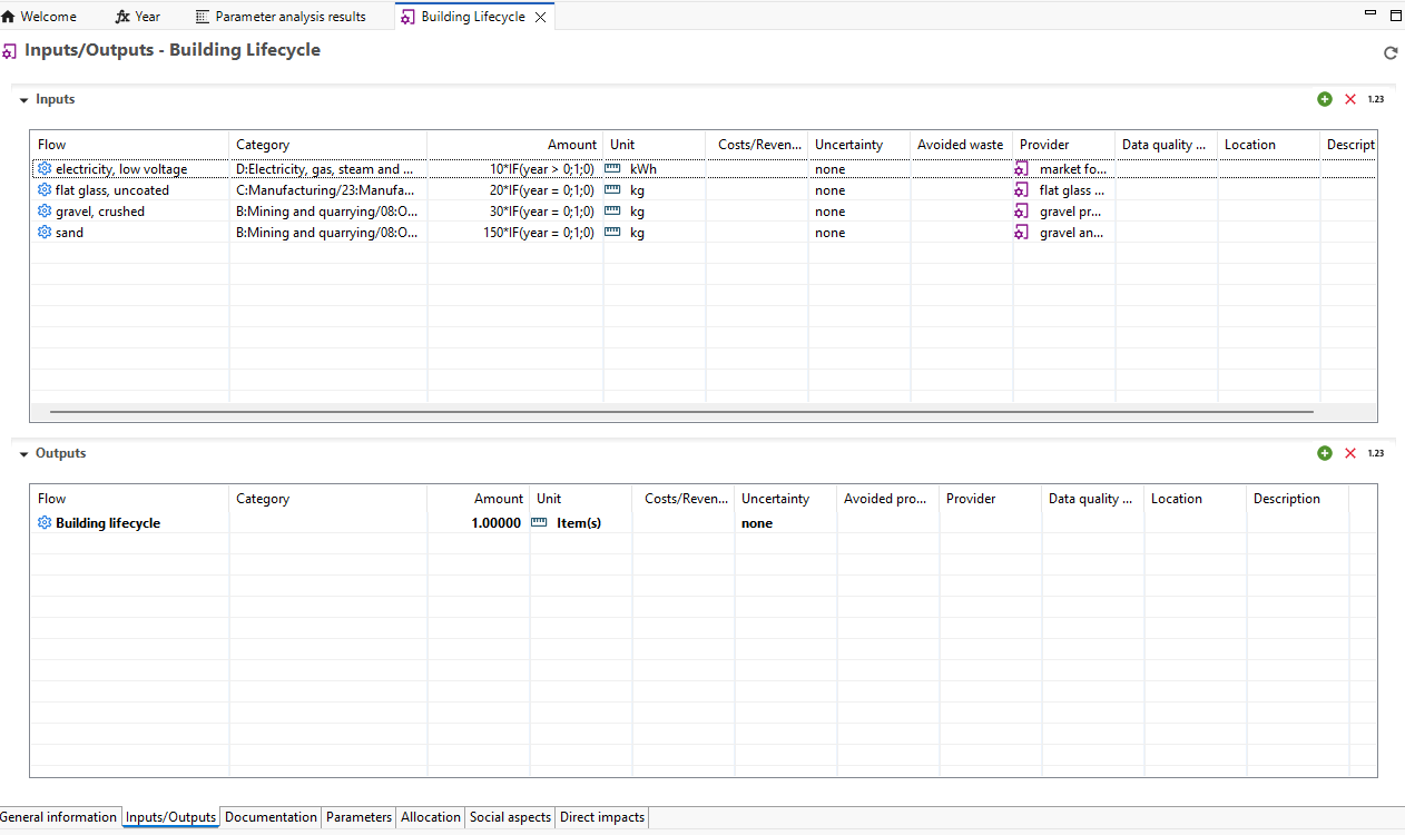 In the beginning, impacts arise from the construction phase. Later, impacts occur during the use phase, end-of-life, and beyond. To model this, you must first define a global input parameter that is referenced in your process(es). In this example, the parameter is Year.