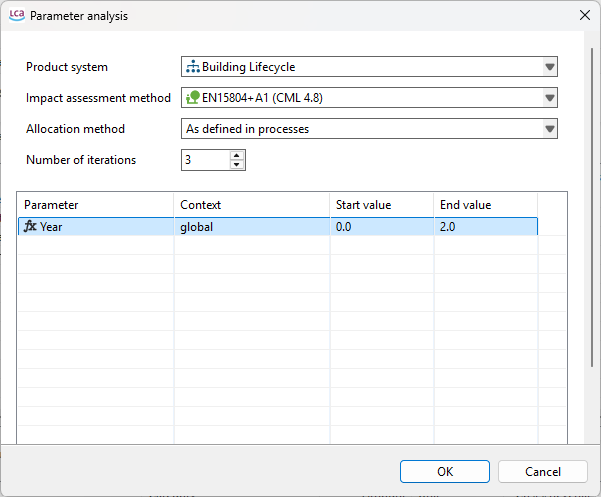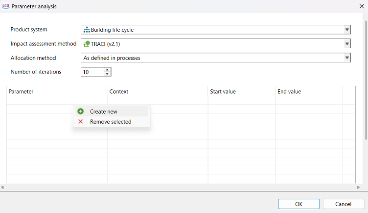 Next, create a product system based on the process. When you open Parameter Analysis (as shown previously), a pop-up window will appear. Select the product system, impact assessment method, and any other required settings.