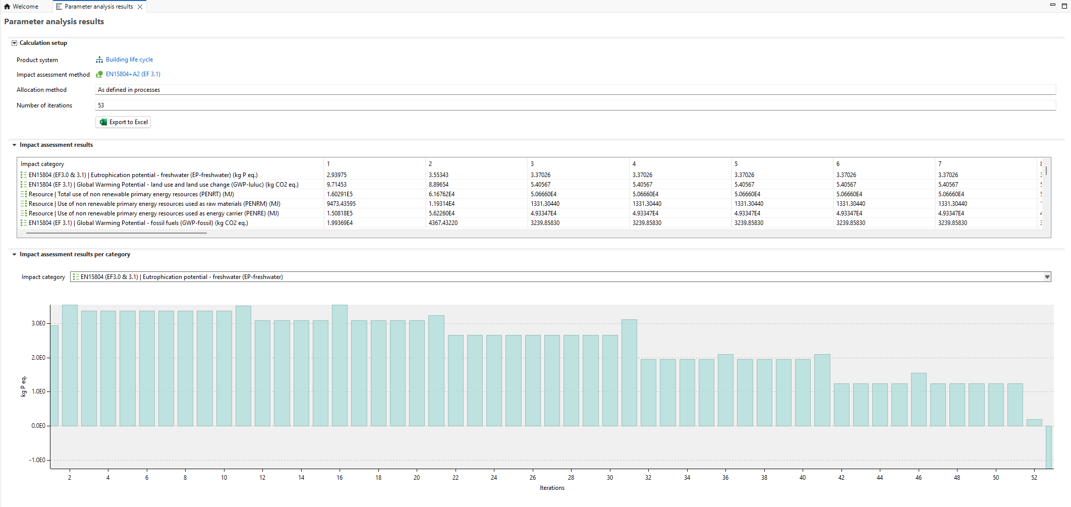 The results will then appear in a graphical and tabular format for each impact category of the selected impact method. You can export the results by clicking Export to Excel at the top.