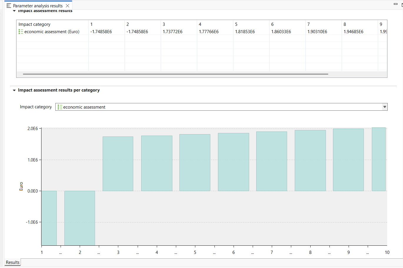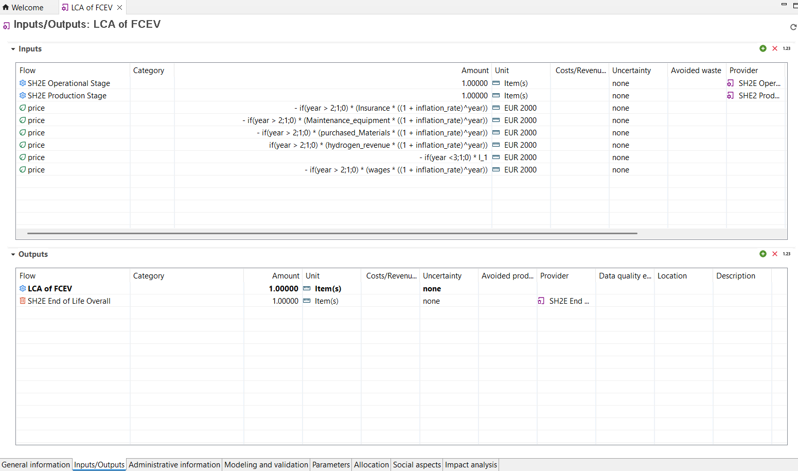 You can further apply time-dependent parameters when modeling life cycle costing. In the example below, capital costs and operational costs are defined separately. Operational costs are multiplied by an inflation rate adjusted using the year factor. Additionally, costs are assigned a negative factor, while revenue for the is assigned a positive factor. This ensures that net costs are calculated correctly.